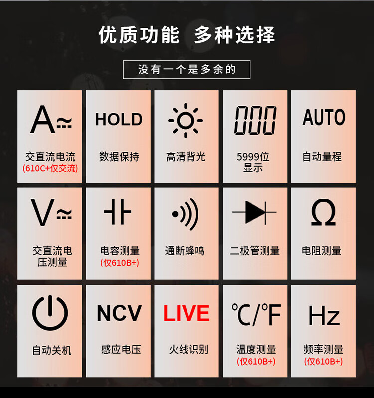 | 特殊功能 | NCV;二极管测试;火线辨别;真有效值;通断测试 |