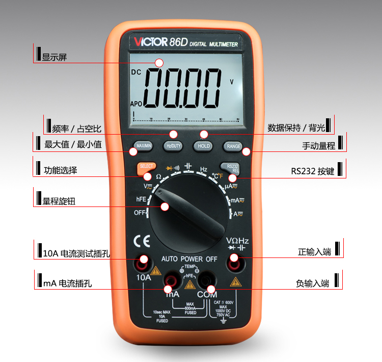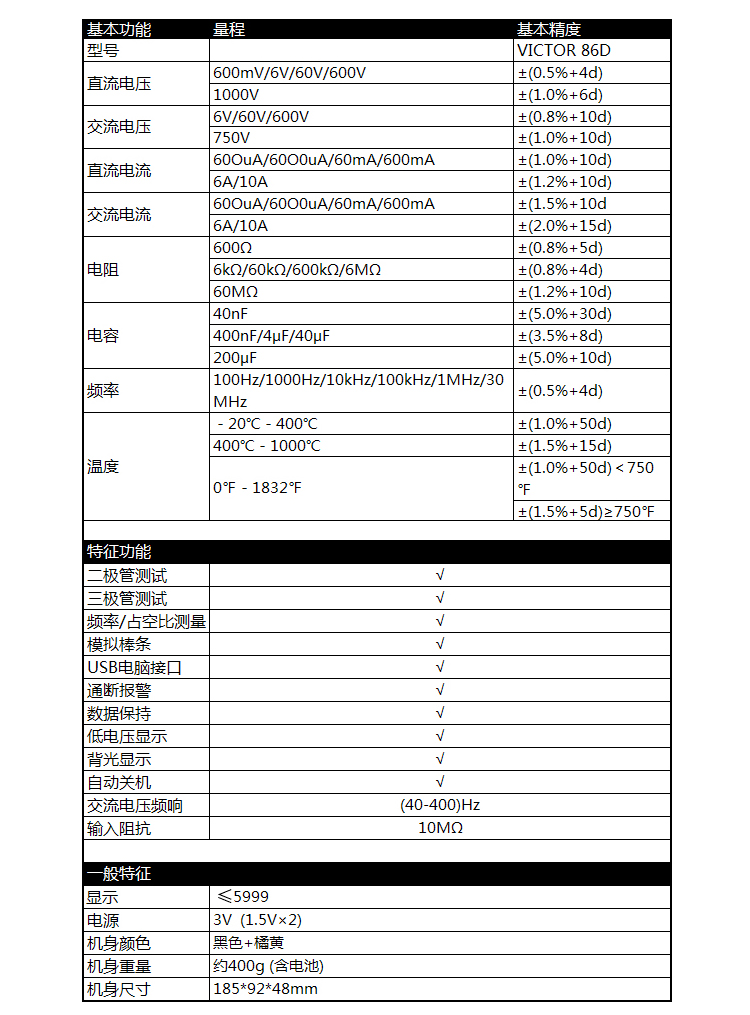 VICTOR(胜利) 数字式手持万用表 VICTOR 86D 三极管测试;二极管测试;通断测试