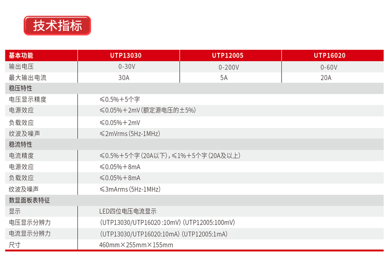 1高精度输出:UTP16020型大功率直流稳压电源具备高精度的电压和电流输出,电压显示精度可达≤0.5%+5个字,电流精度在20A以下时为≤0.5%+5个字,确保了实验和生产中的精确供电。