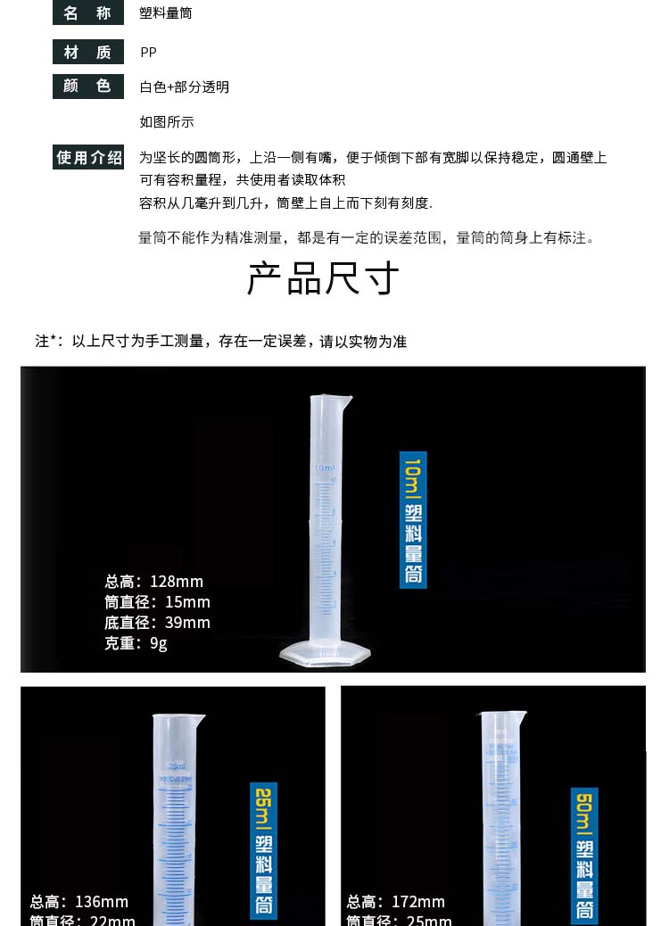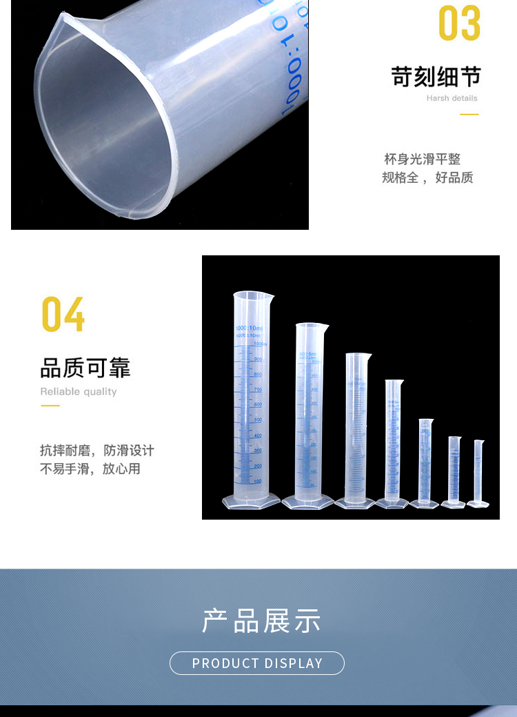 杯身光滑平整,抗摔耐磨,具备一定的防滑特性,操作更安全可靠。该量筒重量轻(10ml规格仅重9g),便于携带与存放。