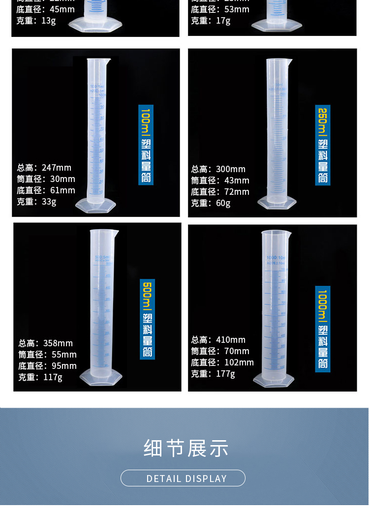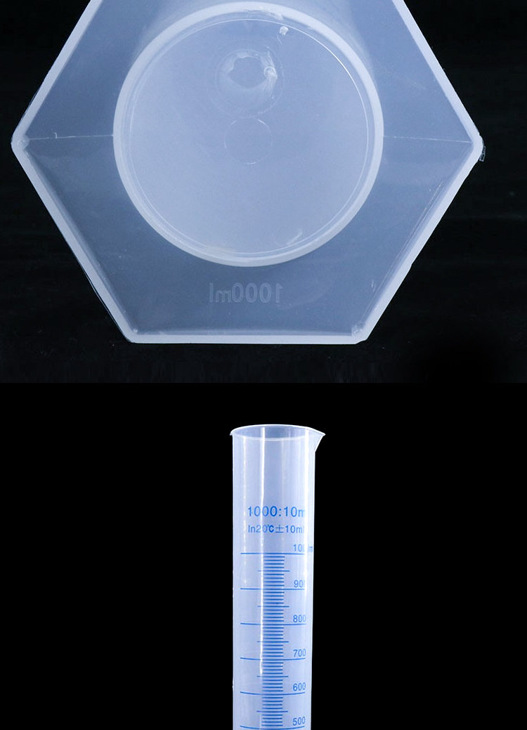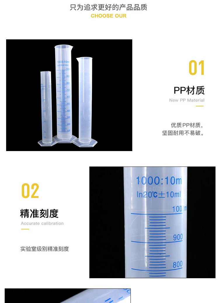 结构设计方面,量筒为坚长圆筒形,上沿一侧设有倾倒嘴,方便液体转移;底部采用六边形宽脚设计,增强稳定性,防止倾倒。