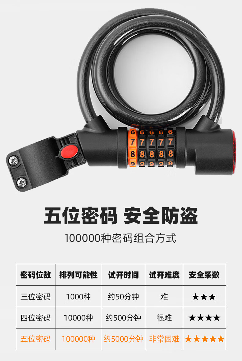 五位数字密码锁,提供100000种组合方式,有效提升防盗安全性