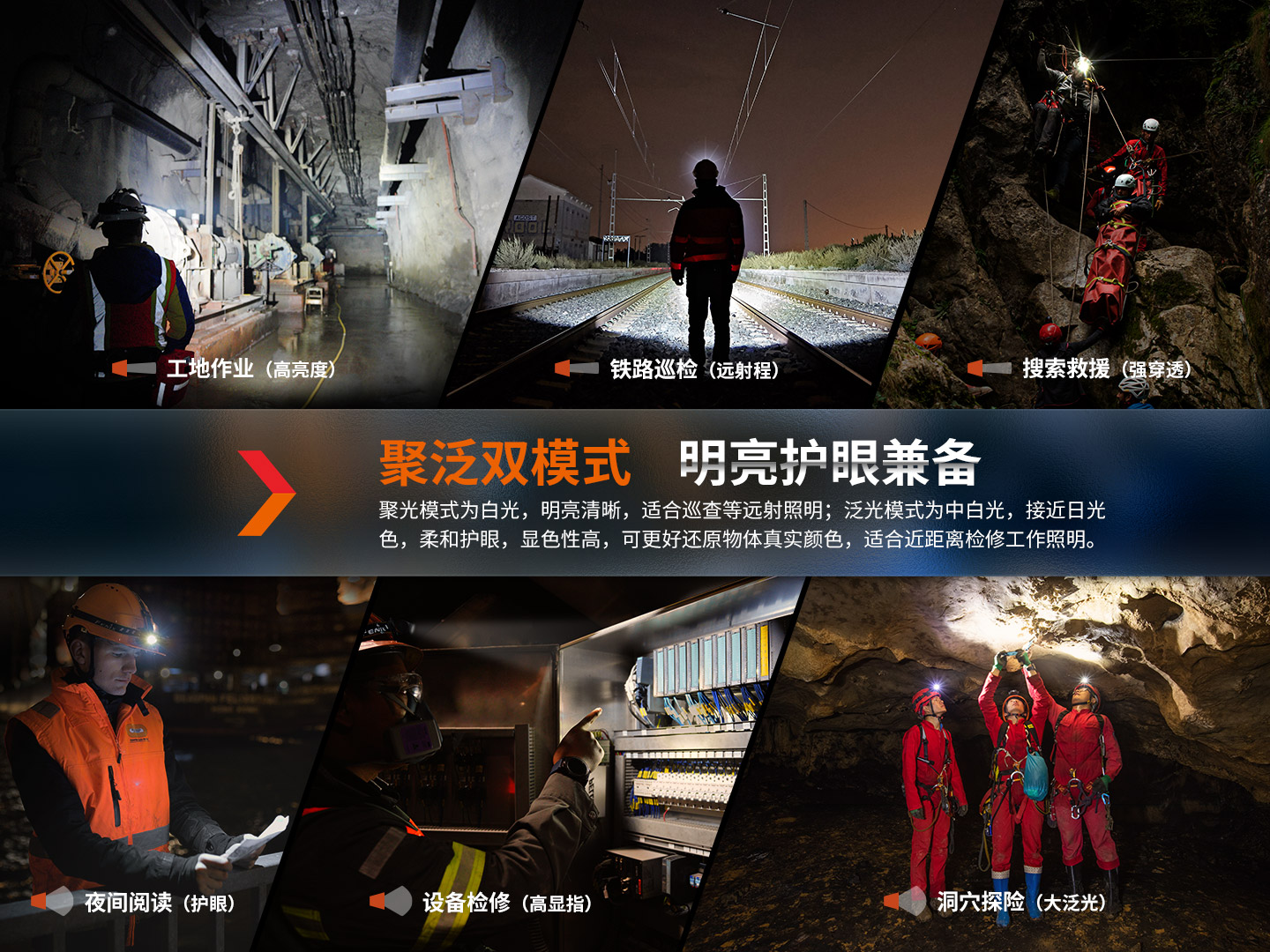 聚泛双光源模式:配备聚光和泛光两种模式,聚光模式适合远距离照明,泛光模式则提供更柔和、均匀的光线,适用于近距离工作。