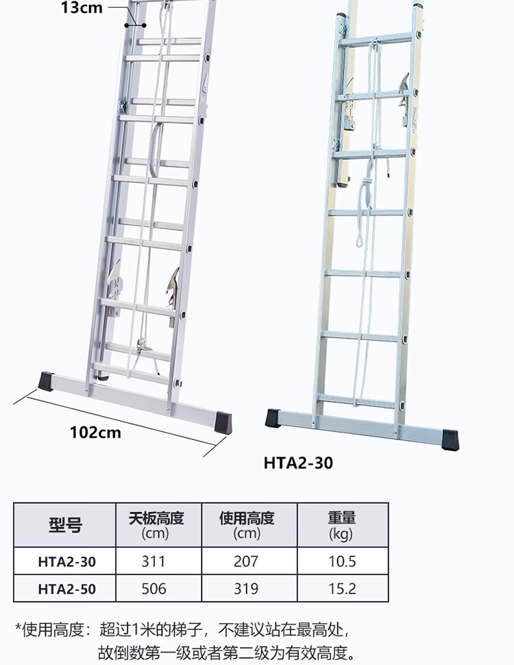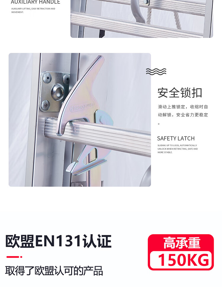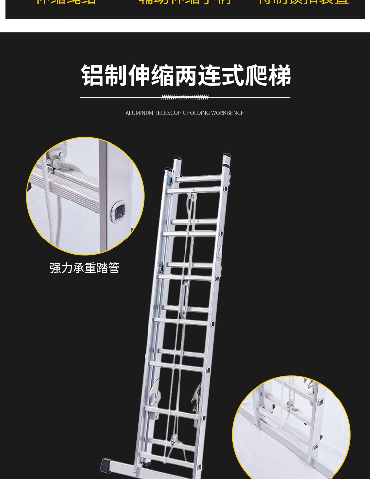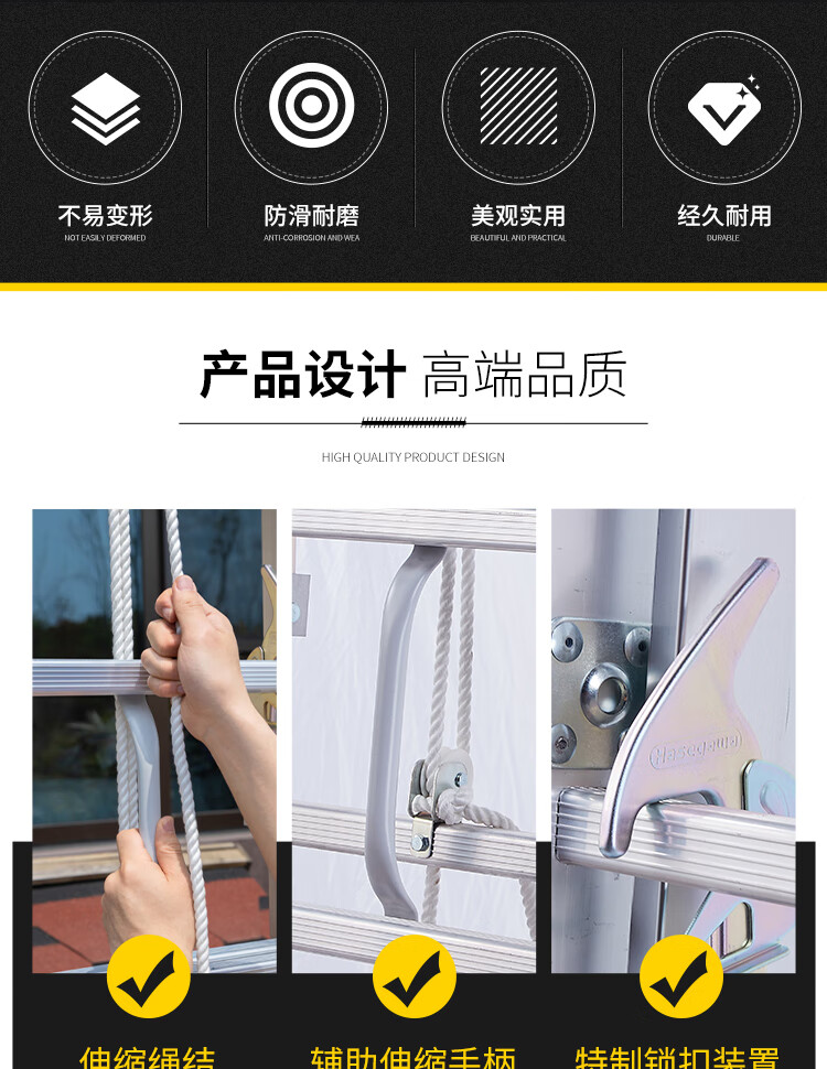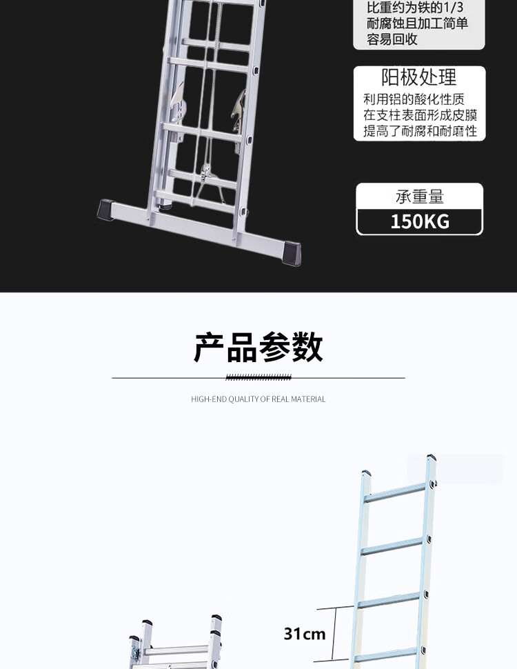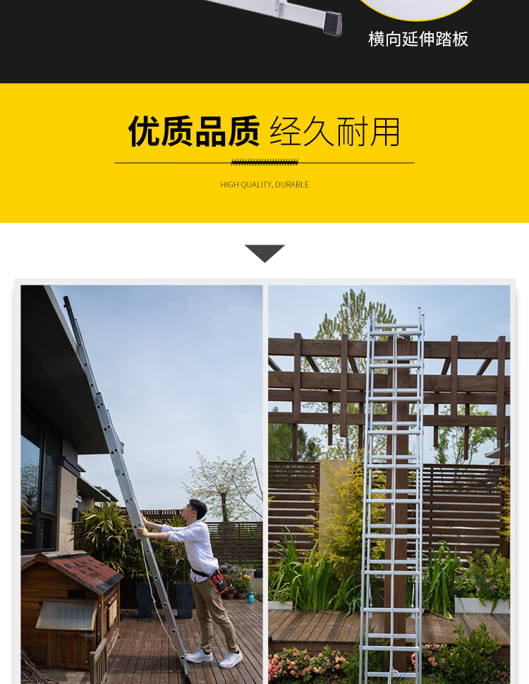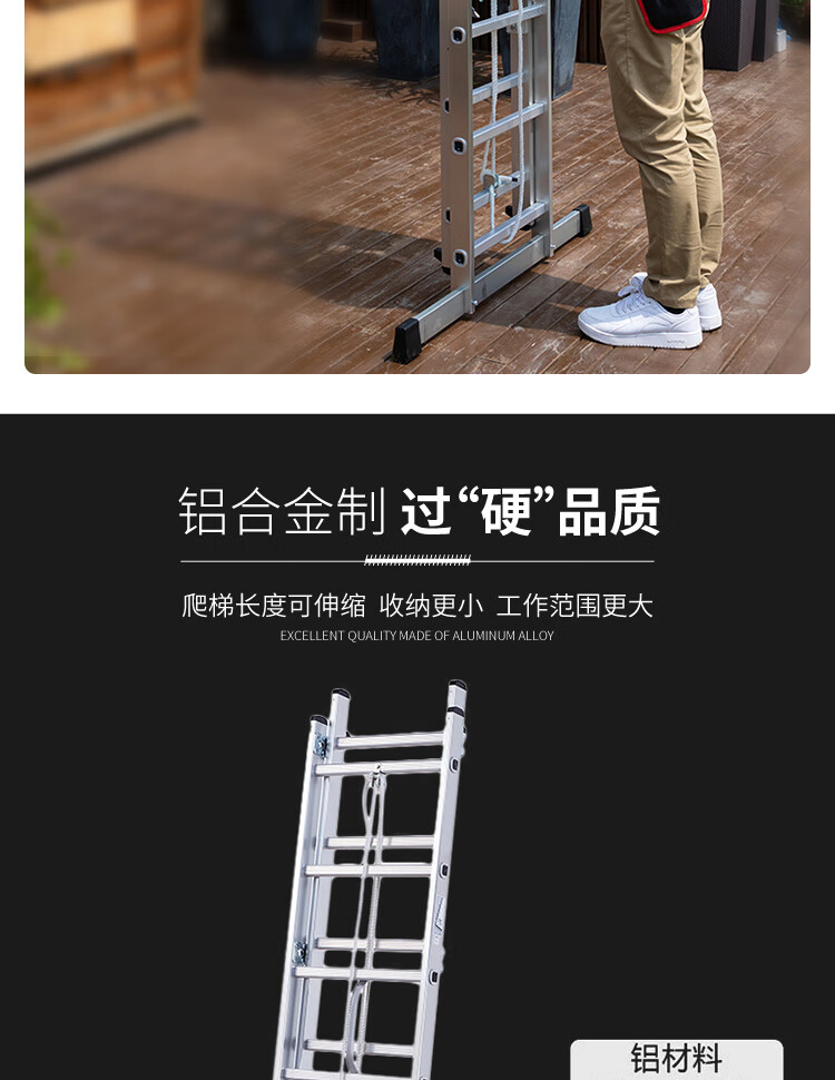 高品质铝合金材质:采用优质铝合金制成,具有重量轻、强度高、耐腐蚀的特点,确保梯子的耐用性和安全性。