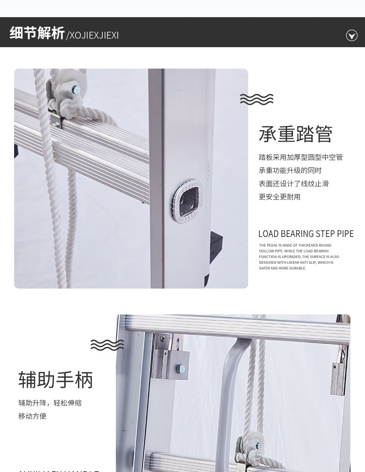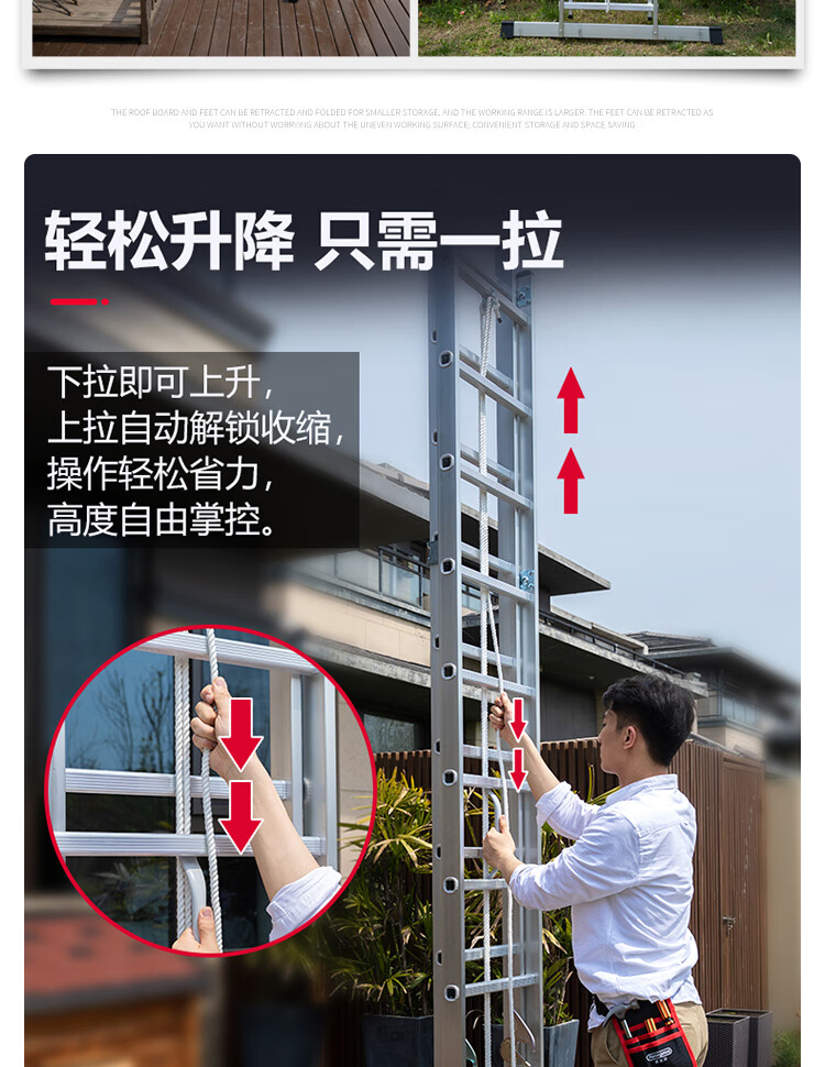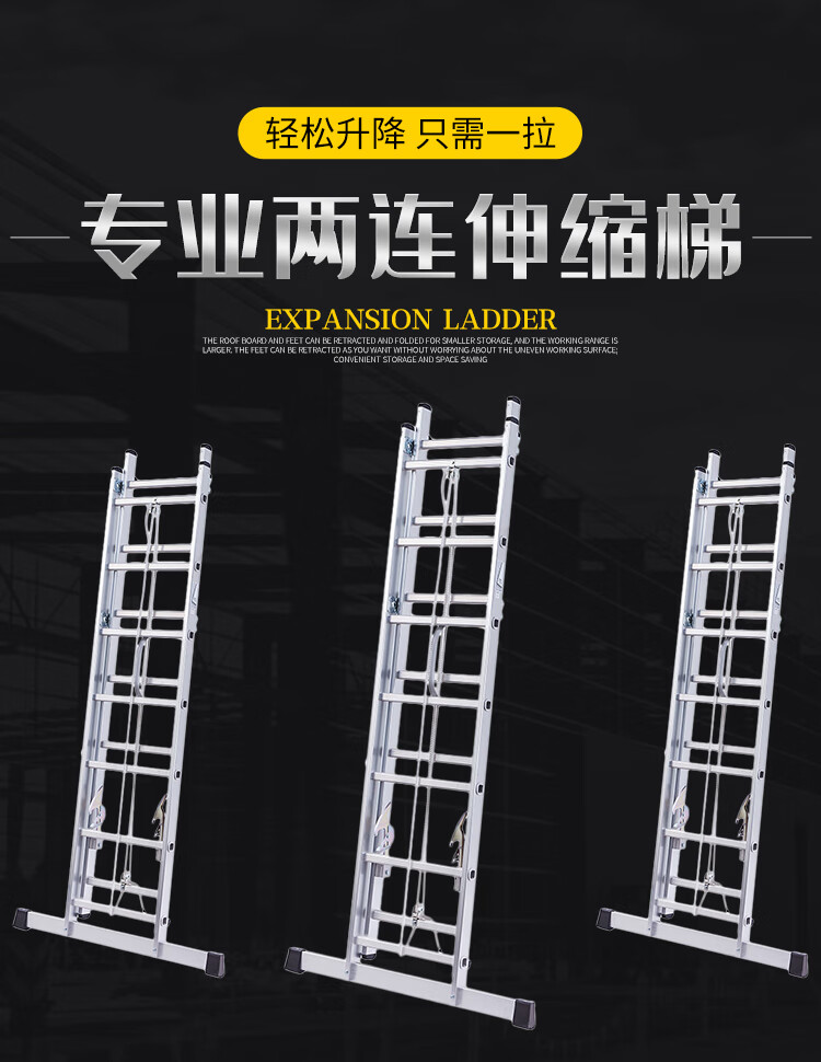 伸缩设计:独特的伸缩结构设计,方便调节梯子的高度,满足不同工作需求,同时便于收纳和携带。