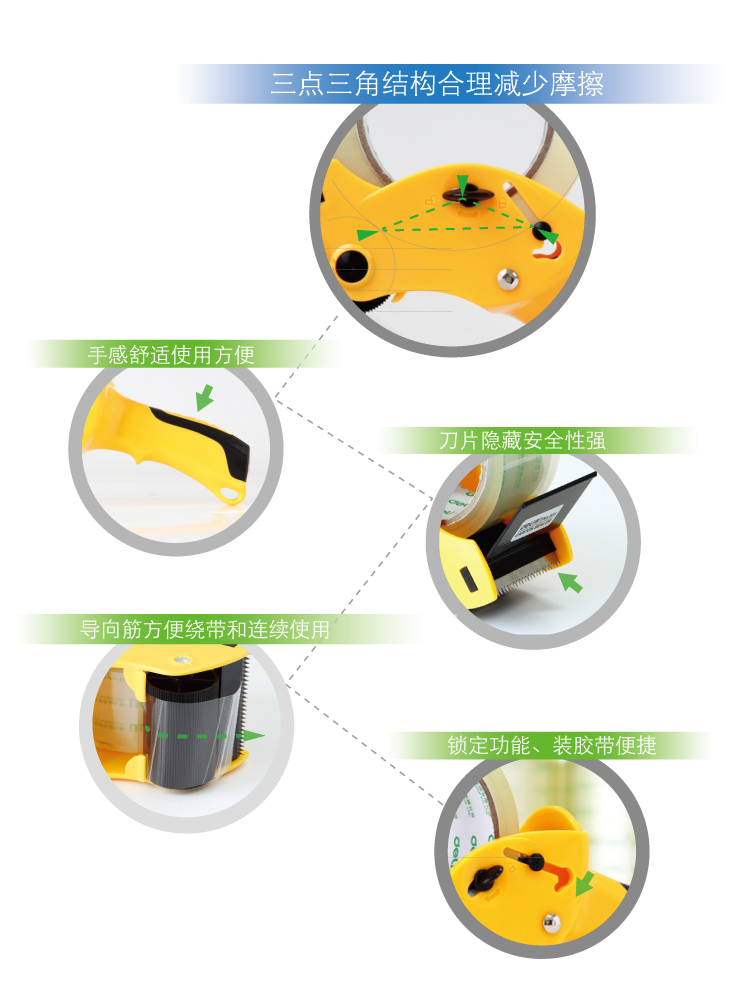 三点三角结构设计,合理减少摩擦,确保胶带顺畅拉出,提高工作效率。