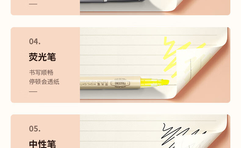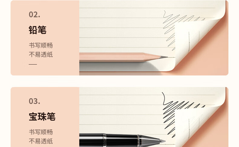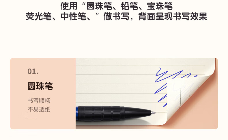 通过多种笔类测试(圆珠笔、铅笔、宝珠笔、中性笔、荧光笔),验证书写效果优异,尤其适合中性笔、宝珠笔等常用书写工具