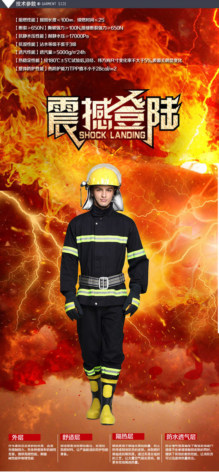 技术参数:阻燃性能损毁长度≤100mm、续燃时间≤2S;断裂≥650N、撕破强力≥100N、接缝断裂强力≥650N;静水压≥17000Pa;沾水等级≥3级;透气量≥5000g/㎡24h;180℃±5℃试验后尺寸变化率≤5%;热防护TPP值≥28cal/cm2;重量≤3.5kg