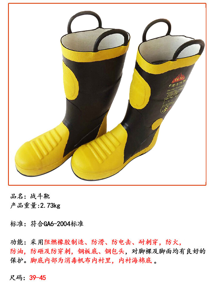 战斗靴符合GA6-2004标准,阻燃橡胶材质,具备防滑、防电击、耐刺穿、防火、防油、防砸性能,钢底板+钢包头保护脚踝及脚面