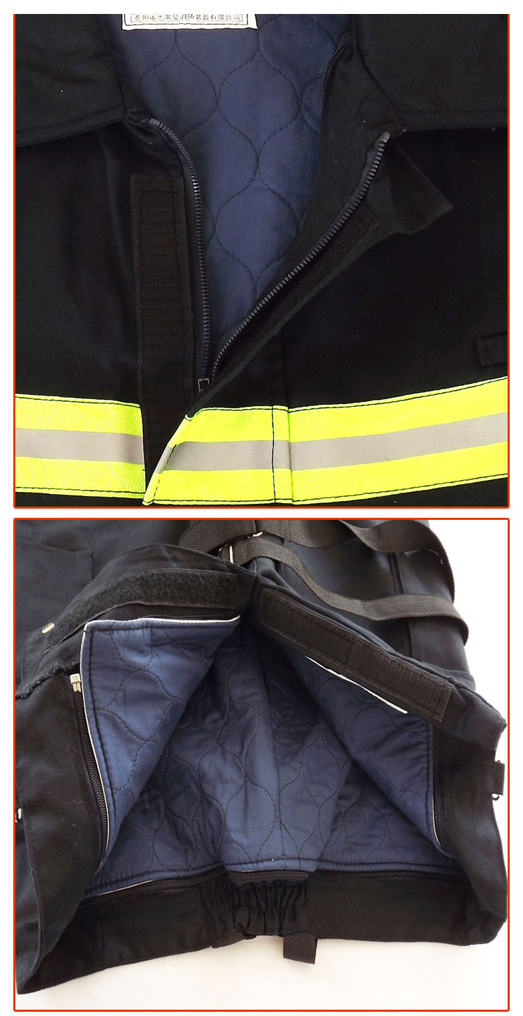 防护服符合GA10-2002标准,采用阻燃面料+隔热毡组合,具备优良防火、隔热、透气性能,反光带为美国3M公司产品,反光效果明显