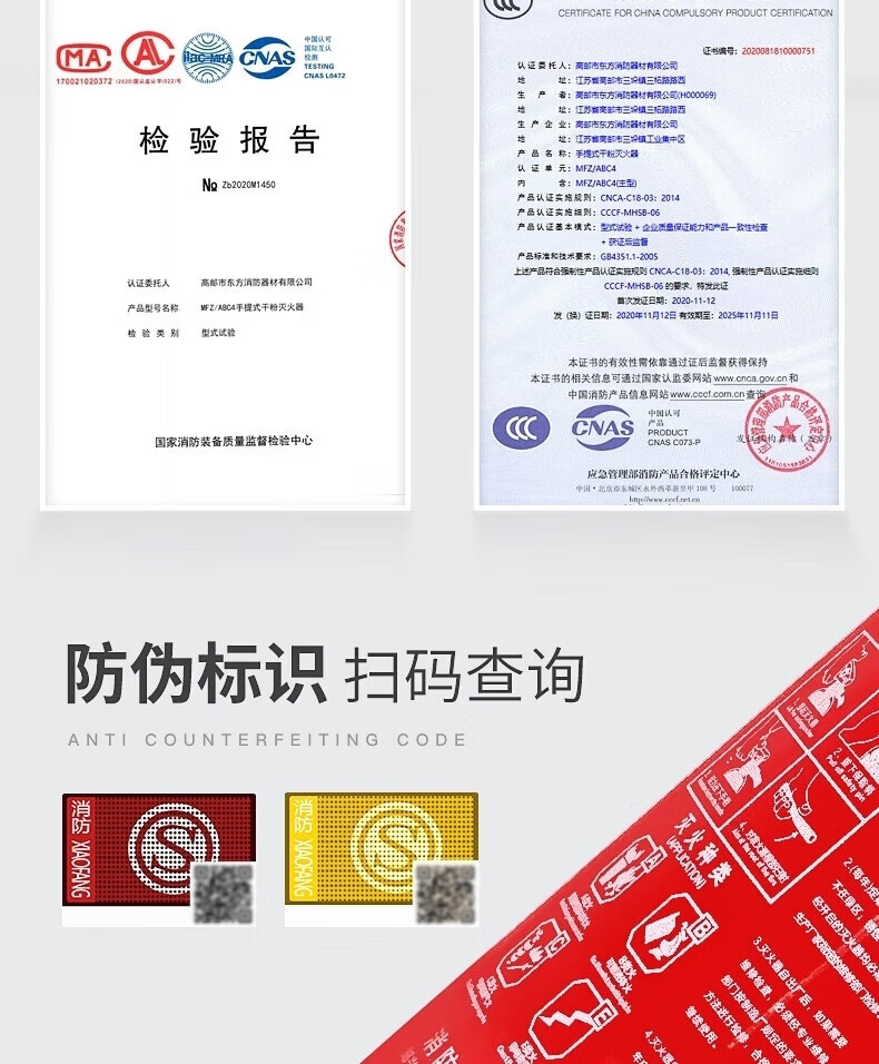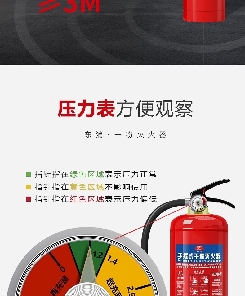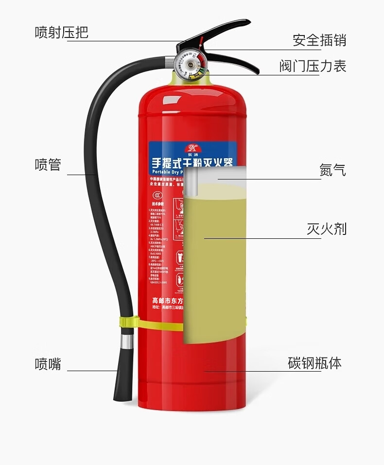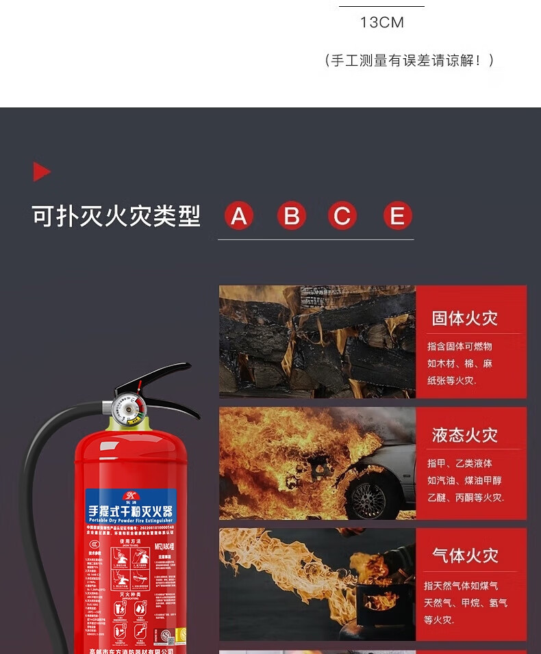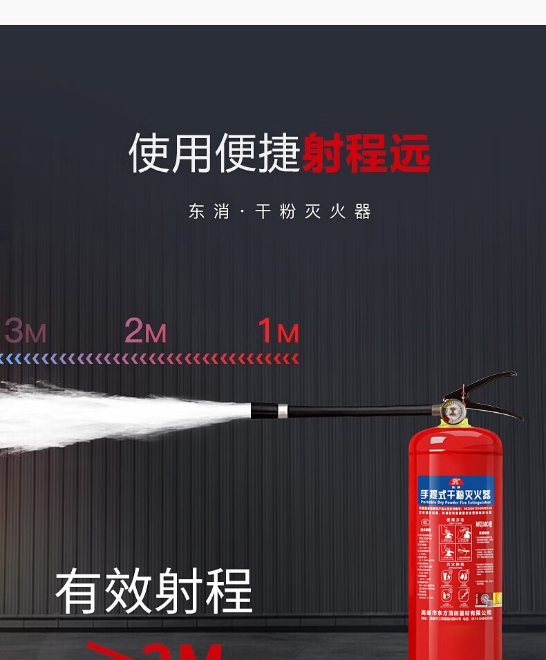 2 灭火剂为干粉灭火剂(磷酸二氢铵75%,硫酸铵15%),有效扑灭A、B、C、E类火灾,适用范围广泛。