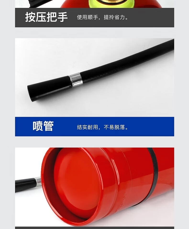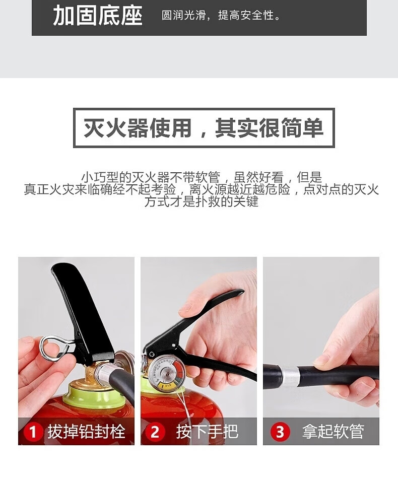 3 使用时,首先拔掉铅封栓,按下手把,拿起软管对准火源根部喷射,注意保持安全距离,避免被火焰灼伤。