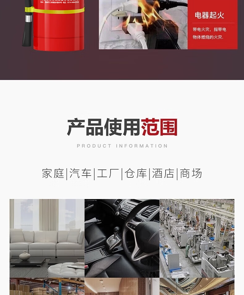 该灭火器适用于家庭、汽车、工厂、仓库、酒店、商场等多种场所。具体应用包括: