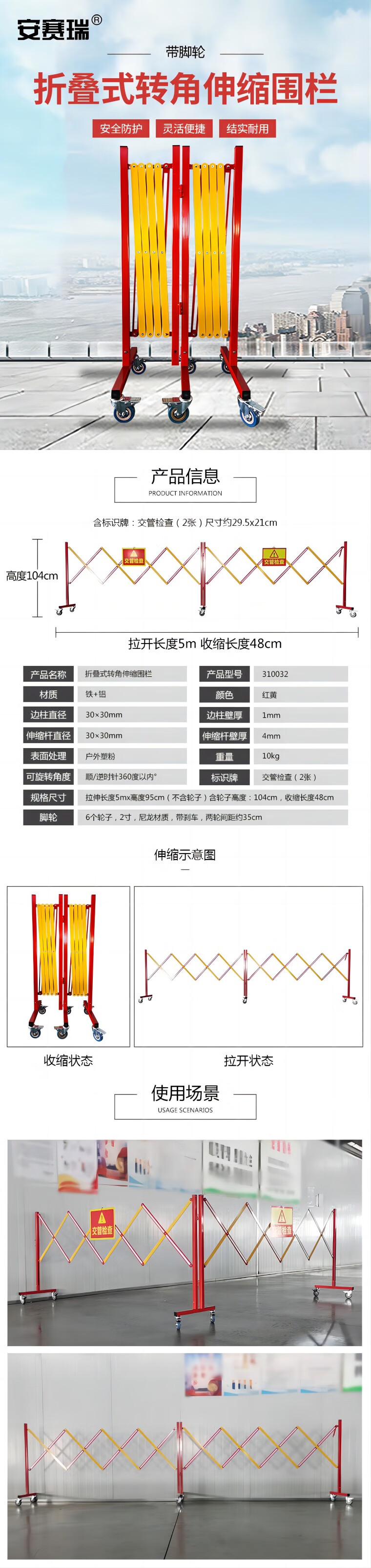 合理尺寸设计:不含轮子高度95cm,含轮子高度104cm,伸缩长度范围适配多种隔离场景