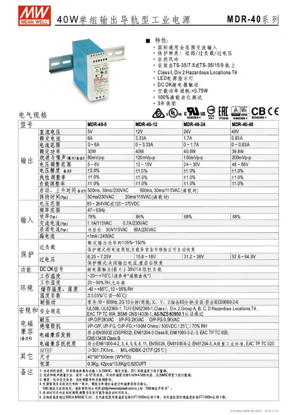 1MDR-40-5是一款由MW(明纬)生产的导轨安装开关电源,提供稳定的5V6A输出,额定功率为30W。
