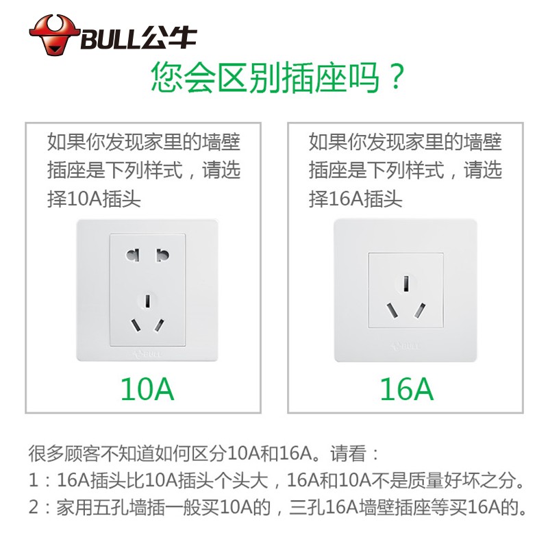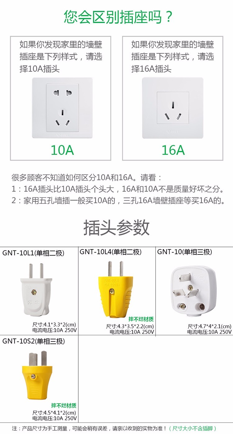 请区分10A与16A插头,10A插头体积小于16A,两者不能混用,10A插头仅适配10A规格的插座