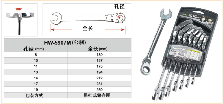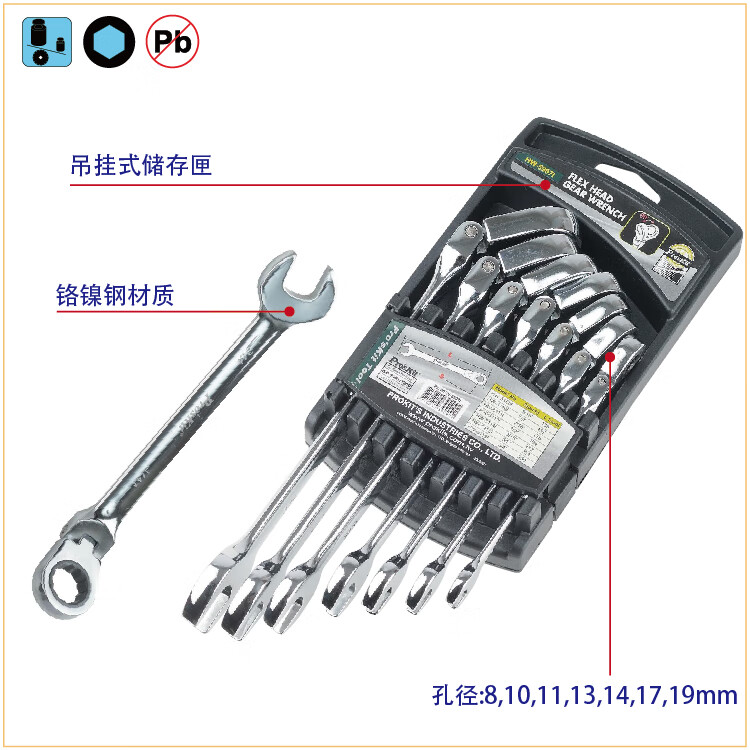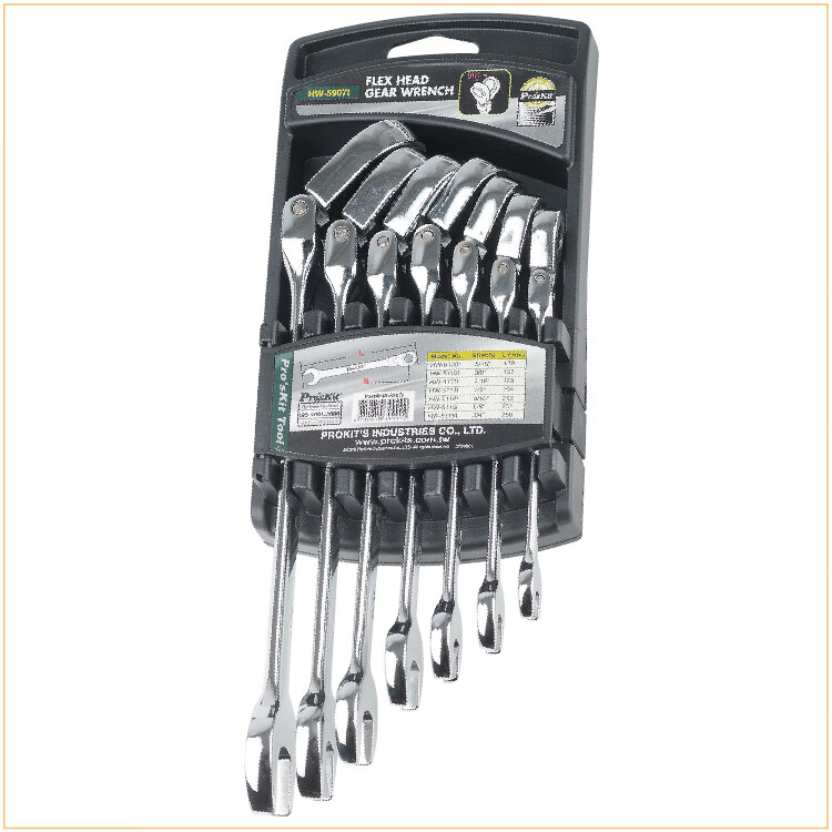 宝工(Pro'skit)HW-5907M 7合1棘轮扳手 广角活动棘轮梅开扳手组8~19mm