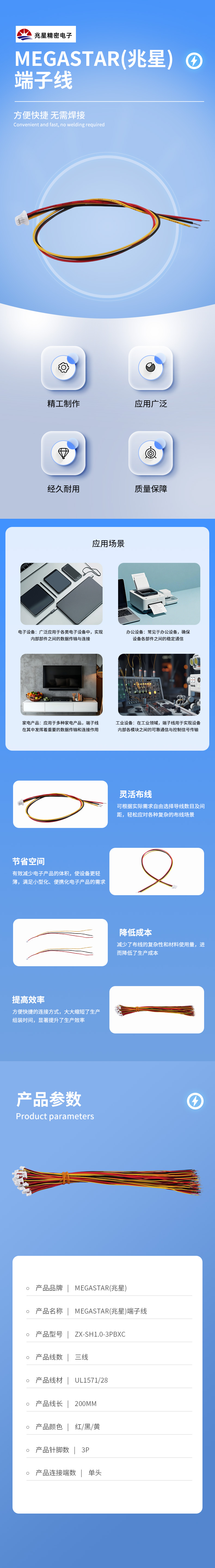 Megastar(兆星)SH1.0 3P 200MM 单端镀锡3.0MM UL1571/28 三线 红/黑/黄