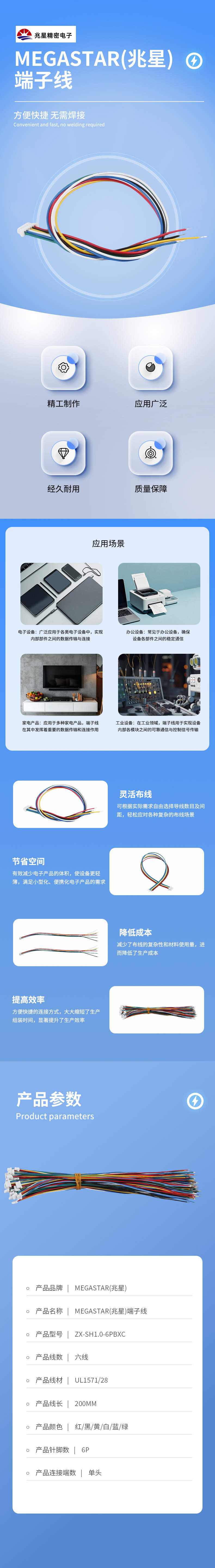 Megastar(兆星)SH1.0 6P 200MM 单端镀锡3.0MM UL1571/28 六线 红/黑/黄/白/蓝/绿