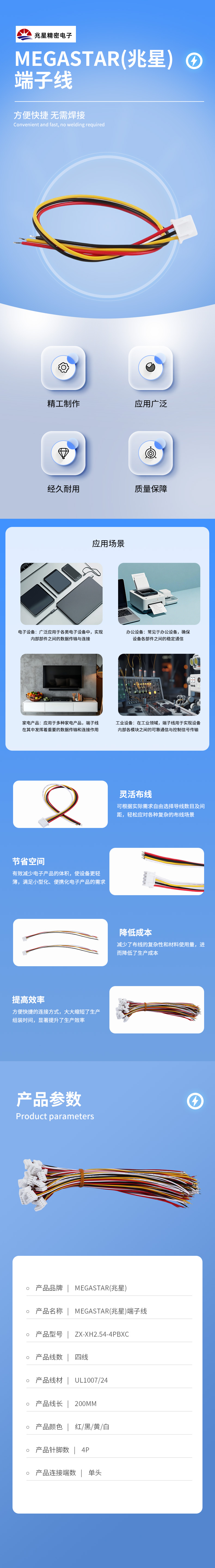 Megastar(兆星)XH2.54 4P 200MM 单端镀锡3.0MM UL1007/24 四线 红/黑/黄/白
