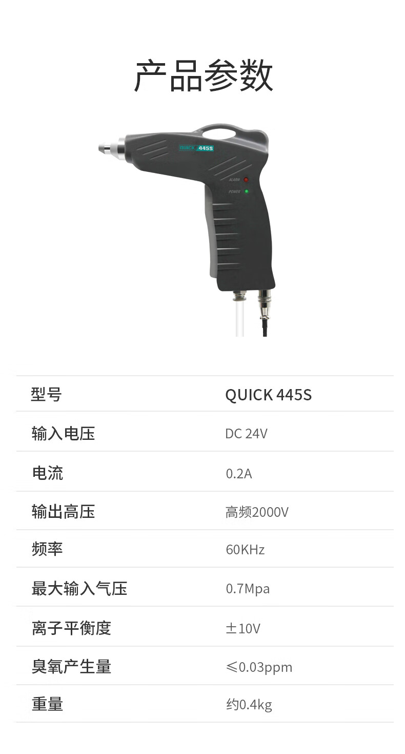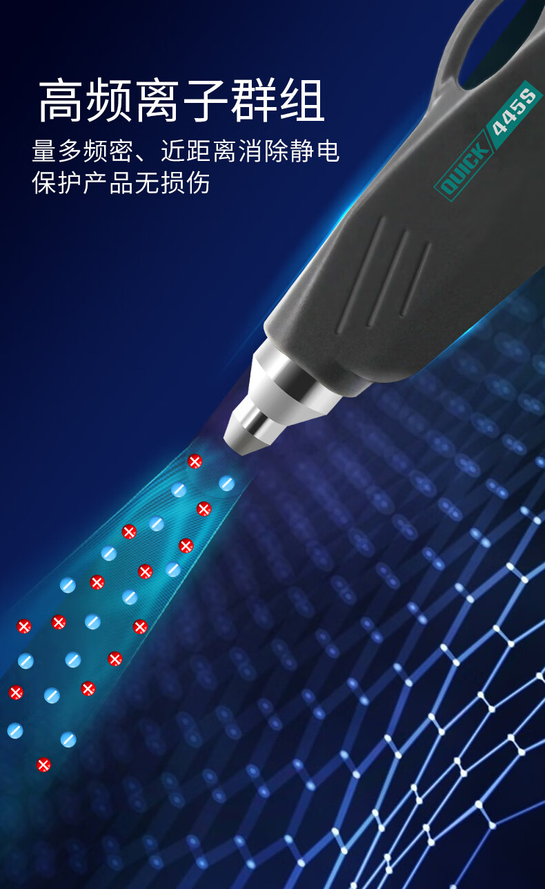 QUICK445S离子吹尘枪采用高频离子技术,能够迅速消除静电,保护敏感电子元件免受静电损害。