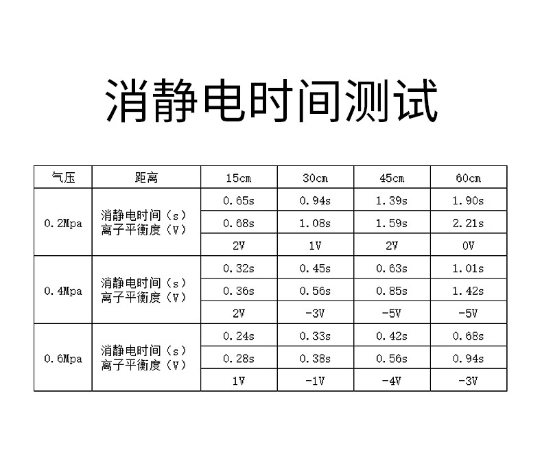快速消静电能力:在不同气压和距离下,消静电时间极短,最高可达0.24秒(气压0.6Mpa,距离15cm)。
