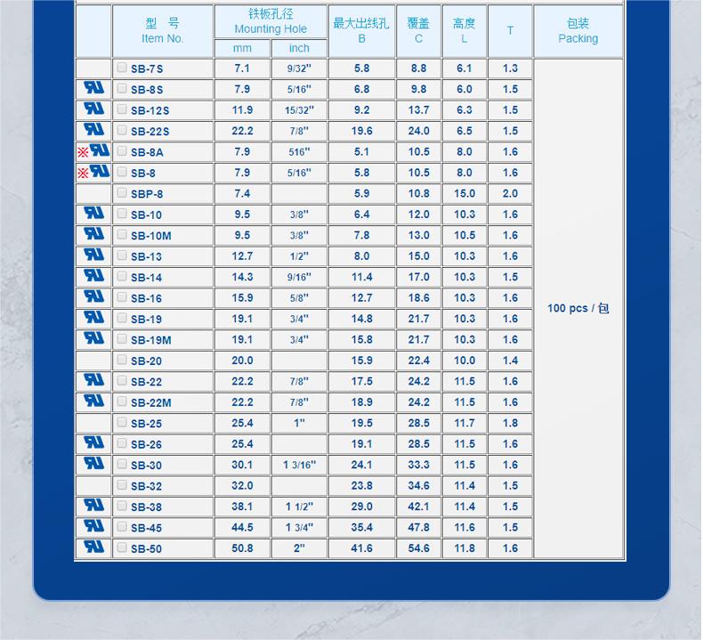 规格适配:型号为SBR10(对应参数表中SB-10),铁板孔径适配9.5mm,最大出线孔直径6.4mm,覆盖尺寸12.0mm,高度10.3mm,T值1.6mm,适配3.2mm以下厚度的铁板(不同型号适配铁板厚度不同,选型时需核对)。