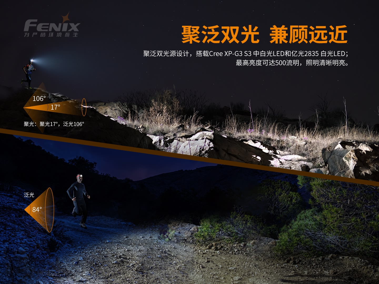 卓越照明性能:聚泛双光源设计,搭载Cree XP - G3 S3中白光LED和亿光2835白光LED,最高亮度500流明,最远射程82米;聚光角度17°、泛光角度106°,兼顾远近照明,清晰呈现地形与路径;支持聚光(高亮500流明、中亮200流明、低亮70流明)和泛光(低亮30流明、SOS4流明)多档位调节,满足不同照明需求。