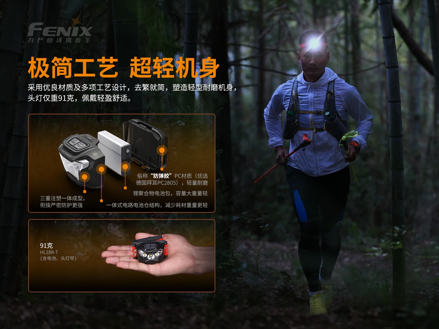 轻量化设计:采用三注重塑一体成型工艺,优选德国拜耳PC2805(俗称“防弹胶”)PC材质,搭配锂聚合物电池包(容量大重量轻)和一体式电路电池仓结构,含电池、头灯带仅重91克,佩戴轻盈无负担。