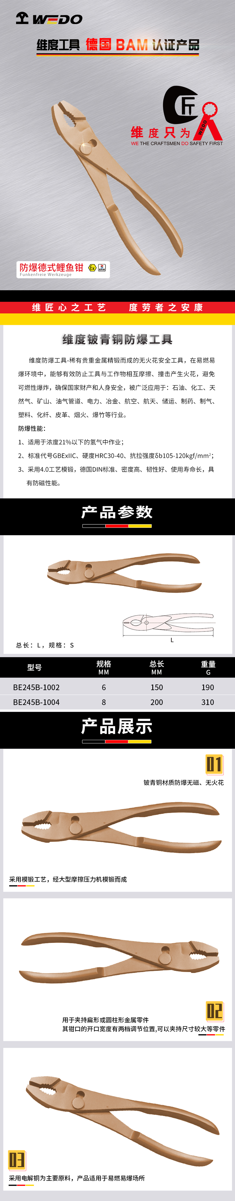WEDO/维度 防爆德式鲤鱼钳 BE245B-1004 8*200mm 的产品特点如下:
