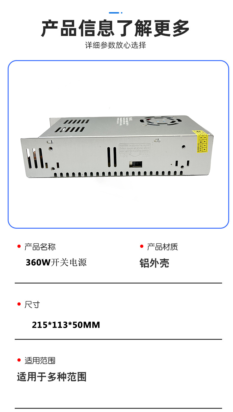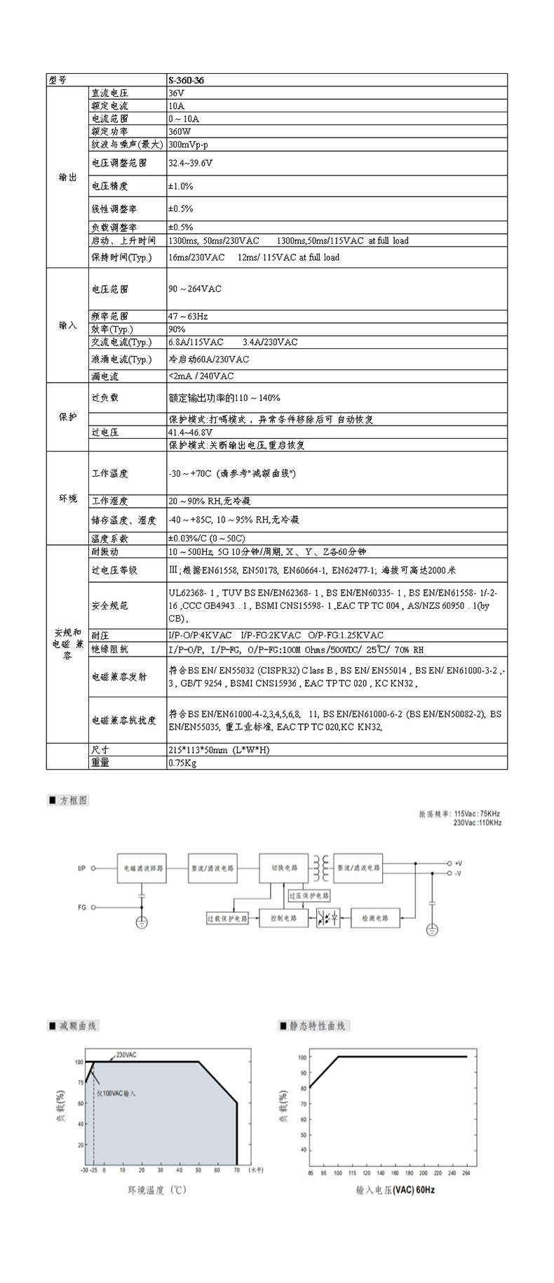 1 高效节能:S-360-36开关电源采用先进的开关技术,峰值效率高达88%,在230VAC/50Hz输入时,平均效率不低于88%,显著降低能耗。