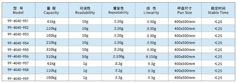 该型号台秤的量程为310kg,可读性为10g,重复性为±20g,线性度为±30g,满足工业环境中对称重精度的高要求。