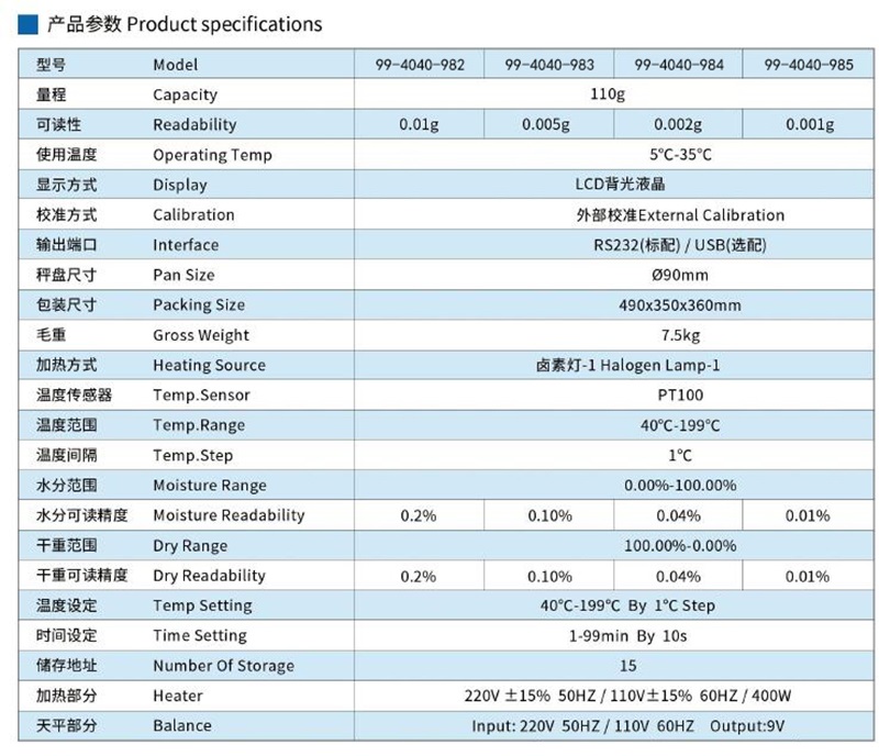 采用卤素灯-1加热方式,温度范围40℃-199℃,温度间隔1℃,可精准控制加热过程