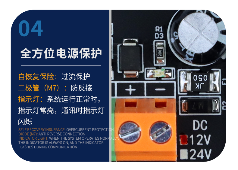 4 宽电压供电:6-36V DC输入,具备过流、过压、防反接保护,保障设备安全运行