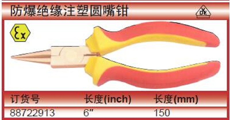 该防爆绝缘注塑圆嘴钳广泛应用于电子、电气、化工、石油等行业的维修和装配工作。