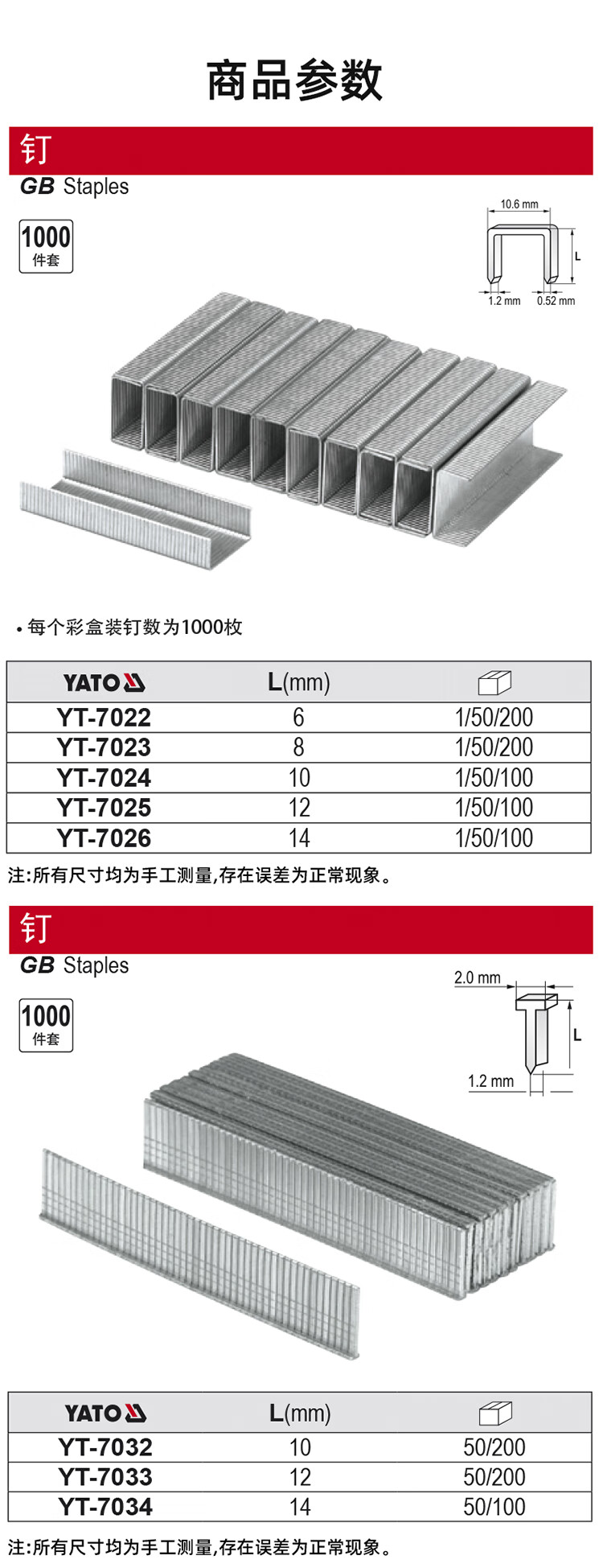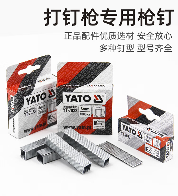 1 本产品为YATO(易尔拓)品牌YT-7025型号枪钉,规格为12mm长度,尺寸参数为10.6×1.2mm,专用于打钉枪配套使用