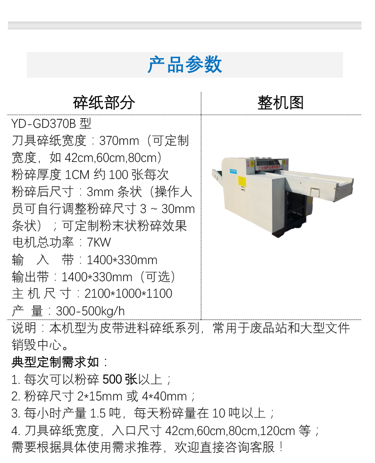 在使用YD-GD370B大型皮带输送条状碎纸机时,请注意以下事项以确保设备安全、高效运行及延长使用寿命: