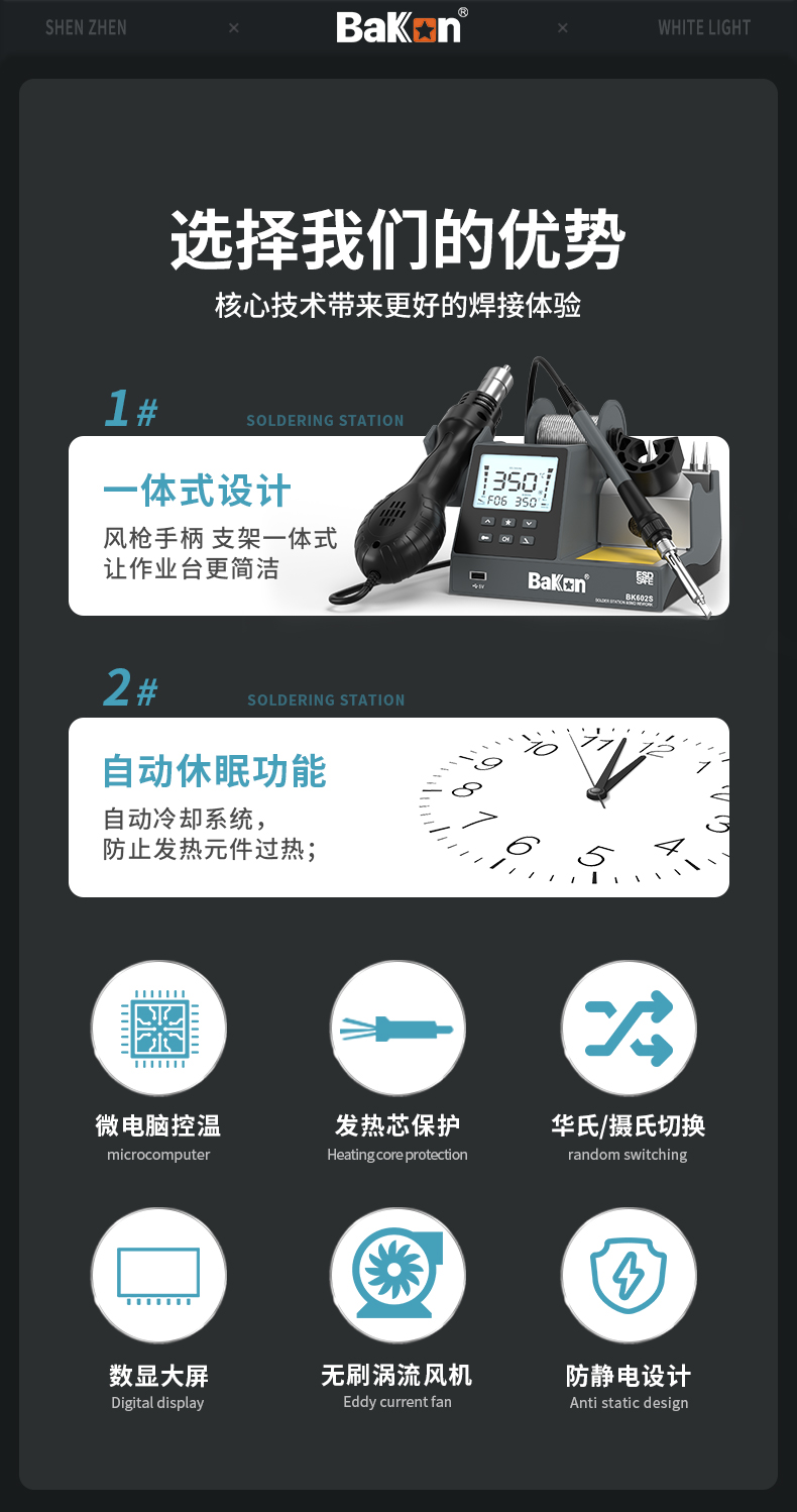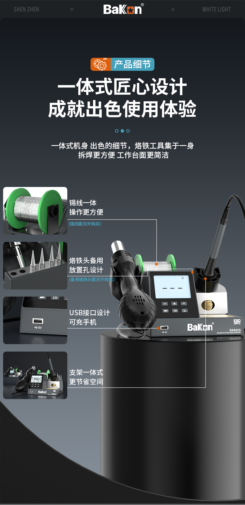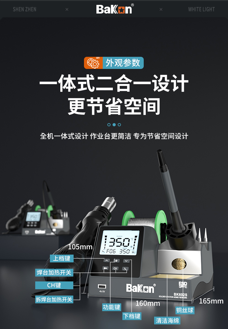 7 一体式机身:工具集于一身,拆焊更方便,工作台面更简洁,节省空间。