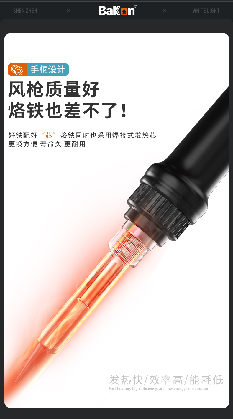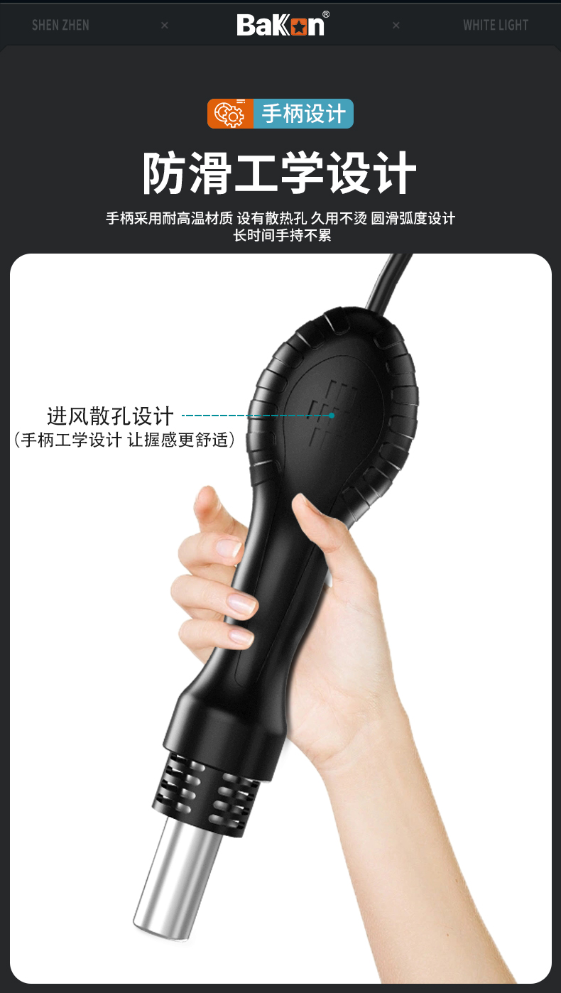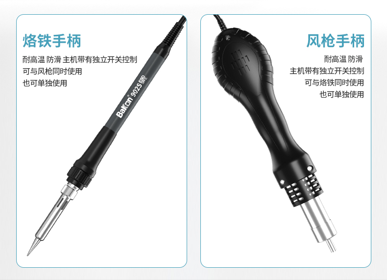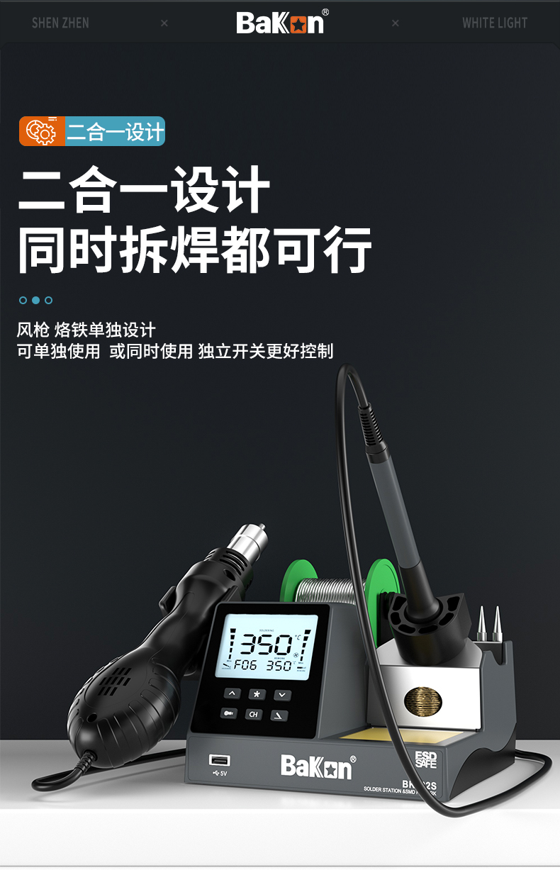 1 二合一设计:集成了热风枪和电烙铁功能,既可单独使用也可同时操作,满足多种焊接需求。
