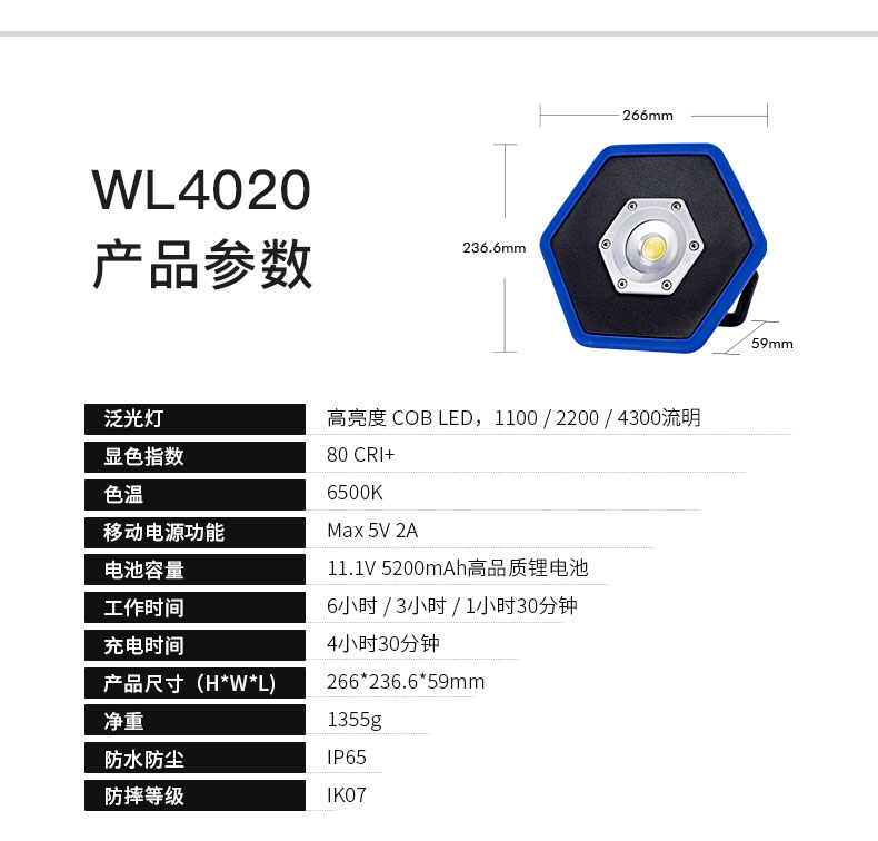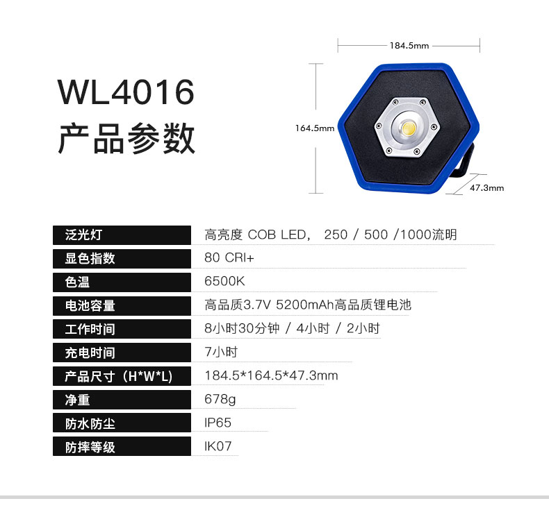 1 高亮度COB LED技术:WL4018采用高亮度COB LED,提供500/1000/2100流明的照明强度,确保在各种环境下都能提供充足的光线。