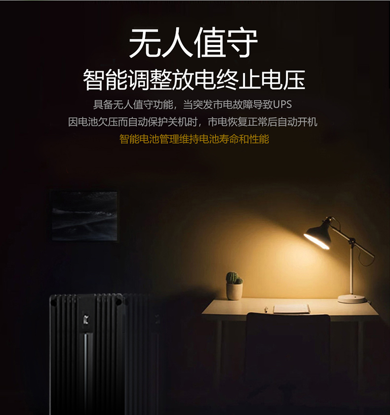 6**无人值守功能**:智能调整放电终止电压,市电恢复正常后自动开机,智能电池管理维持电池寿命和性能。