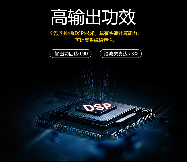 3**高输出功效**:全数字控制(DSP)技术,输出功因达0.90,谐波失真度小于3%,提高系统稳定性。
