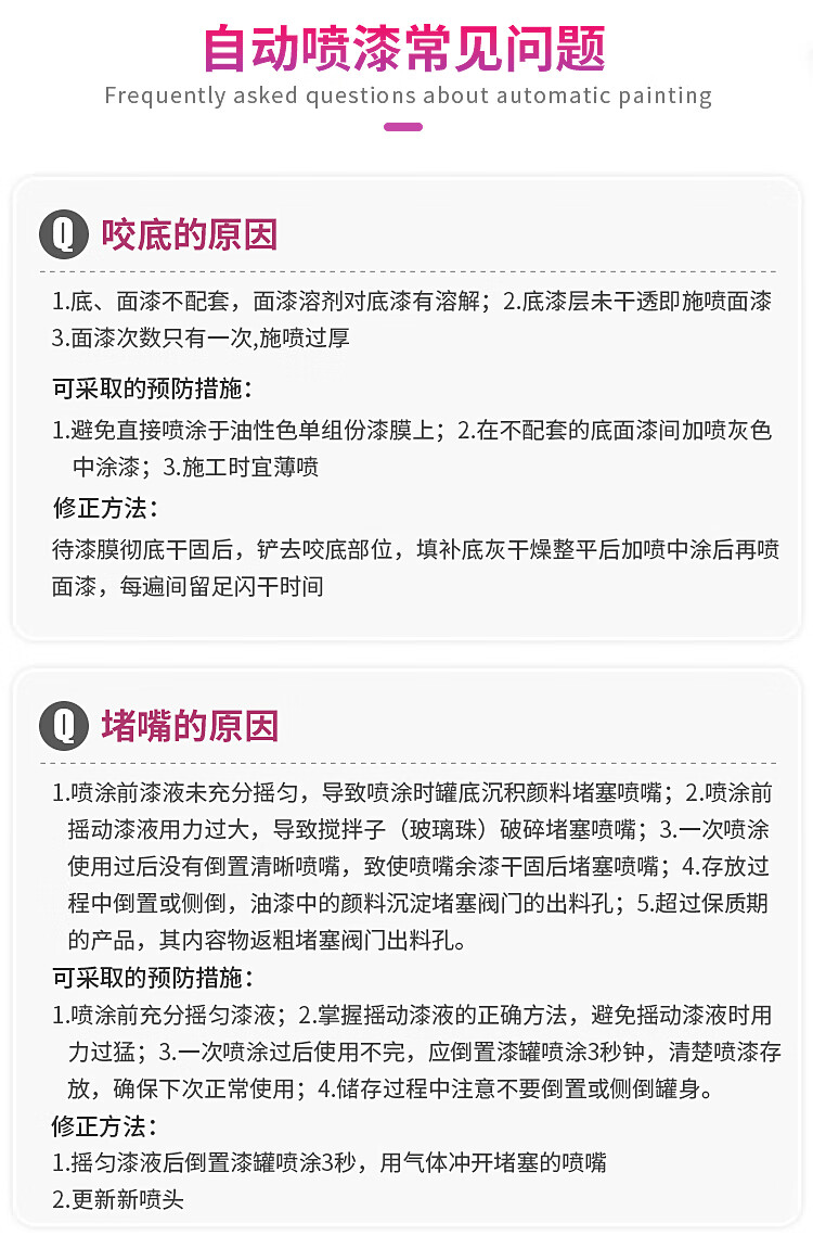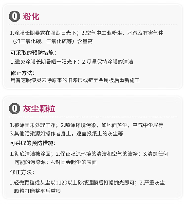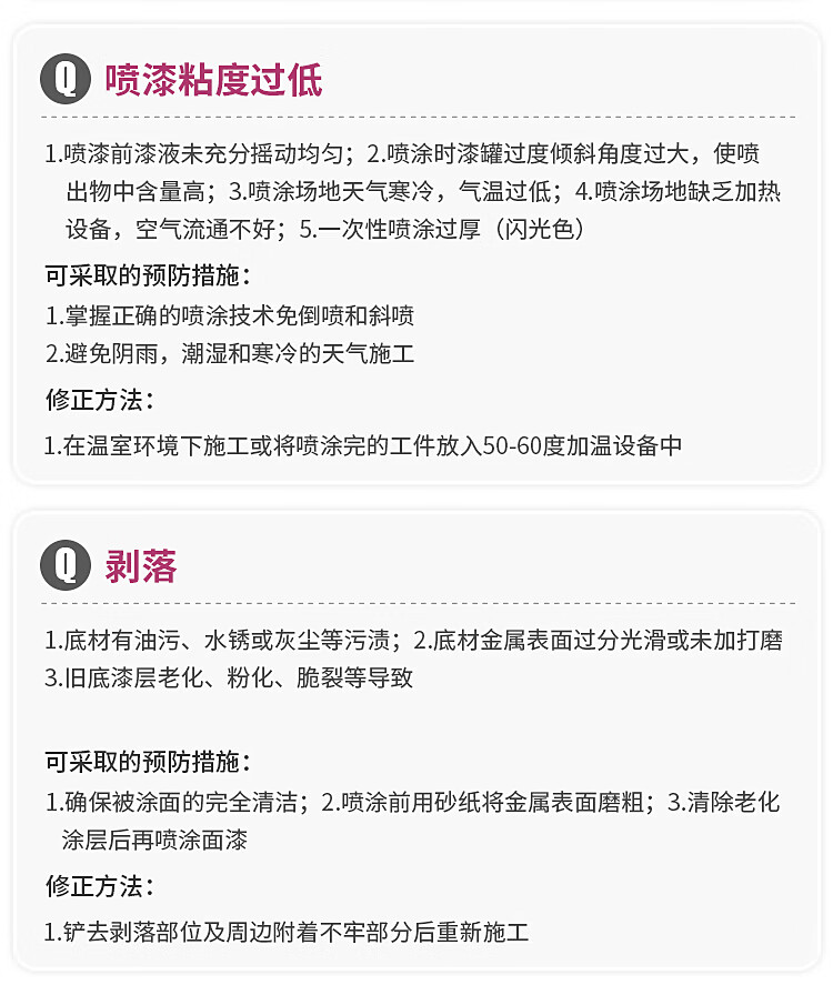 如遇常见问题如咬底、堵嘴、喷不完、脱落或开裂、喷漆粘度过低、剥落、干喷、锈蚀等,可参照产品说明书采取相应预防和修正措施。