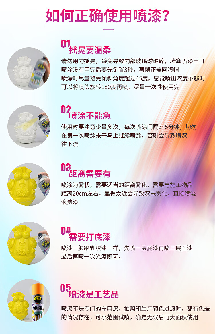 喷涂时距离被喷物体20cm左右,不要一次性喷太厚,每次喷涂间隔3-5分钟,防止漆往下流。