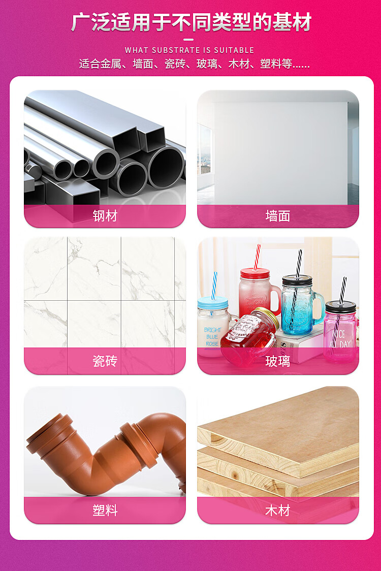 广泛适用性:适用于金属、墙面、瓷砖、玻璃、木材、塑料等多种基材,满足不同场景的喷涂需求。