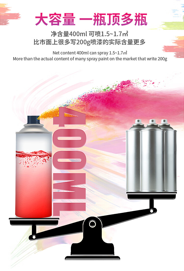 大容量设计:净含量400ml,可喷涂面积达1.5至1.7平方米,比市面上许多标称200g的喷漆实际容量更多,更具性价比。