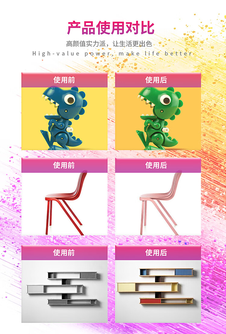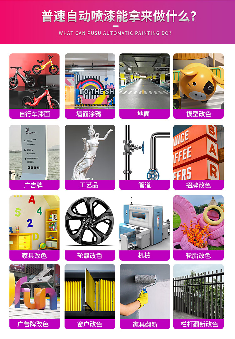 其他应用场景:自行车漆面、墙面涂鸦、地面、模型改色、广告牌、工艺品、管道、招牌改色、家具改色、轮毂改色、机械、轮胎改色、广告牌改色、窗户改色、家具翻新、栏杆翻新改色等,几乎涵盖所有需要表面处理的领域。