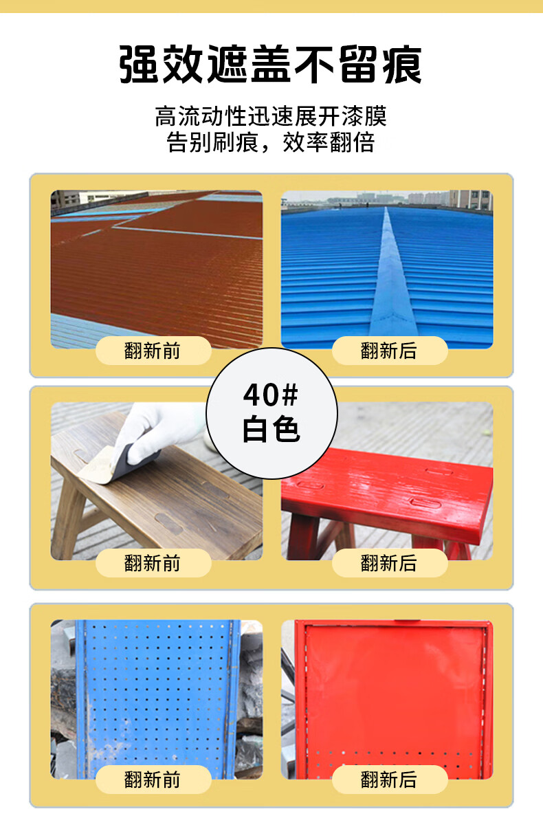 强效遮盖:高流动性迅速展开漆膜,遮盖力强,能够有效遮盖基材原有颜色和瑕疵。