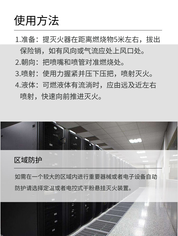 3 操作规范:使用前需拔出保险销,站在上风口,对准火源根部喷射;不可直接对准人喷射,避免造成伤害。