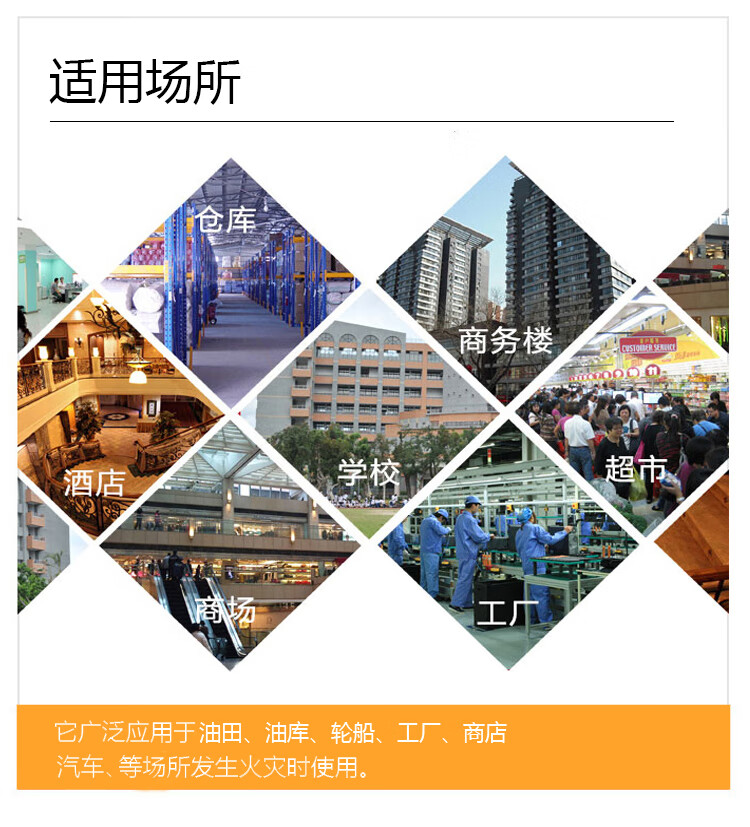 该灭火器广泛应用于油田、油库、轮船、工厂、商店、汽车等场所的初期火灾扑救,具体使用场景包括: